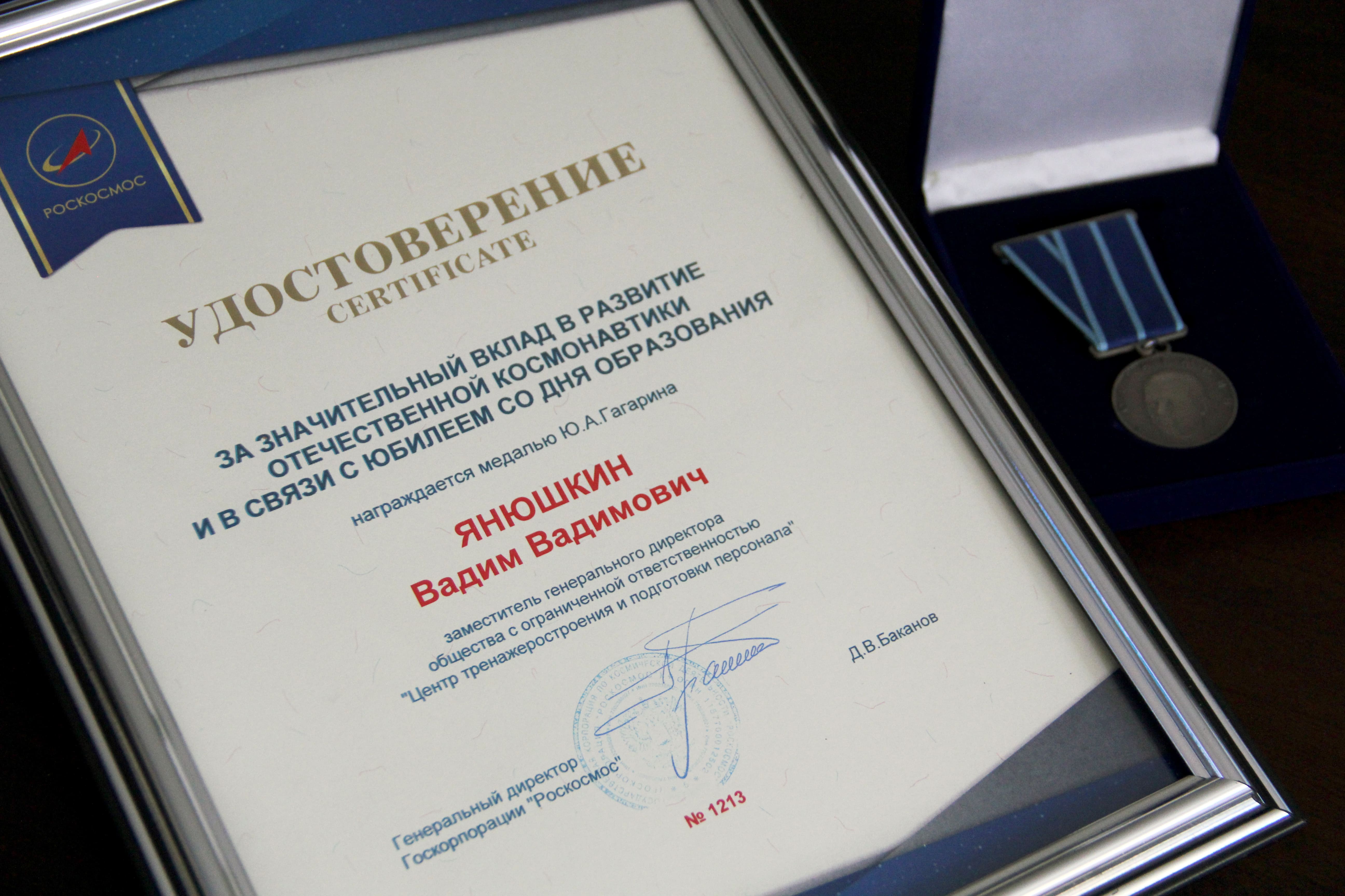Медаль Ю.А.Гагарина, учрежденная Госкорпорацией «Роскосмос», была вручена заместителю генерального директора В.В.Янюшкину.